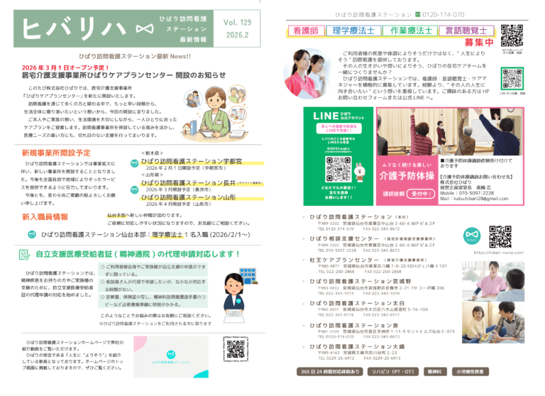 ヒバリのこころ2026年2月号配布中です!今回のインタビューは、宮城県仙台市のかえる在宅クリニック様とえみこ在宅クリニック様のインタビュー記事を掲載させていただいております! -